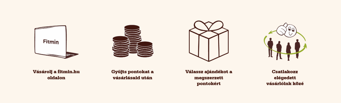 Örömmel értesítünk, hogy ezentúl még kedvezőbbek lesznek a vásárlásaid. Elindítottuk a Fitmin webáruház minden regisztrált vásárlója számára a hűségprogramot. A tagság ingyenes, és semmilyen kötelezettséggel nem jár. A hűségprogramba történő regisztráció után minden vásárlásért pontokat kapsz, amelyeket az aktuális ajándékokból válthatsz be. Az ajándékok kínálata rendszeresen frissül. 400 pont összegyűjtése után válthatsz be ajándékot, és a megfelelő pontmennyiséget levonjuk a fiókodból. Ha a fiókodban lévő pontok száma az adott ajándék értékénél kevesebb, nem tudod azt beváltani vagy a kosaradhoz adni.